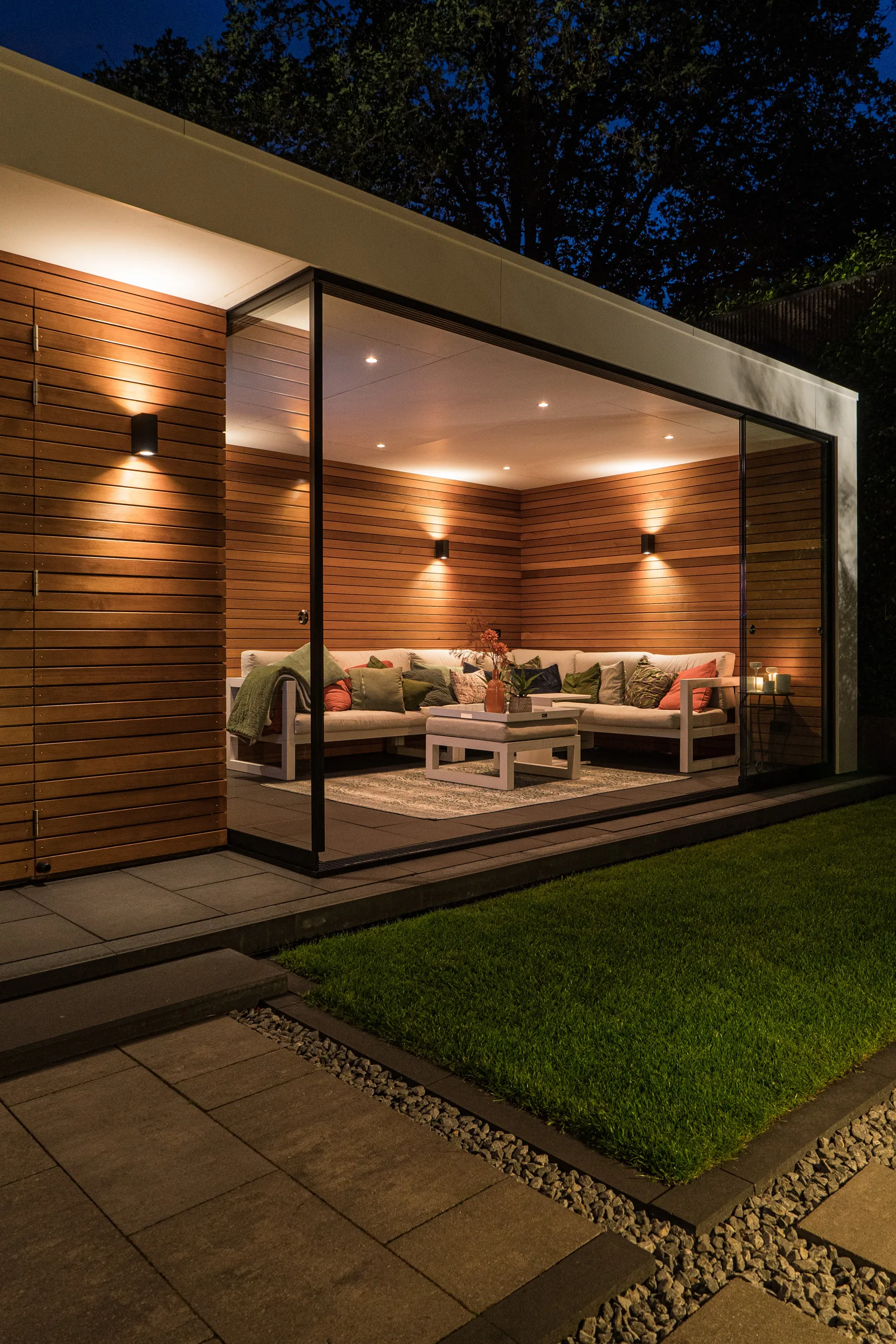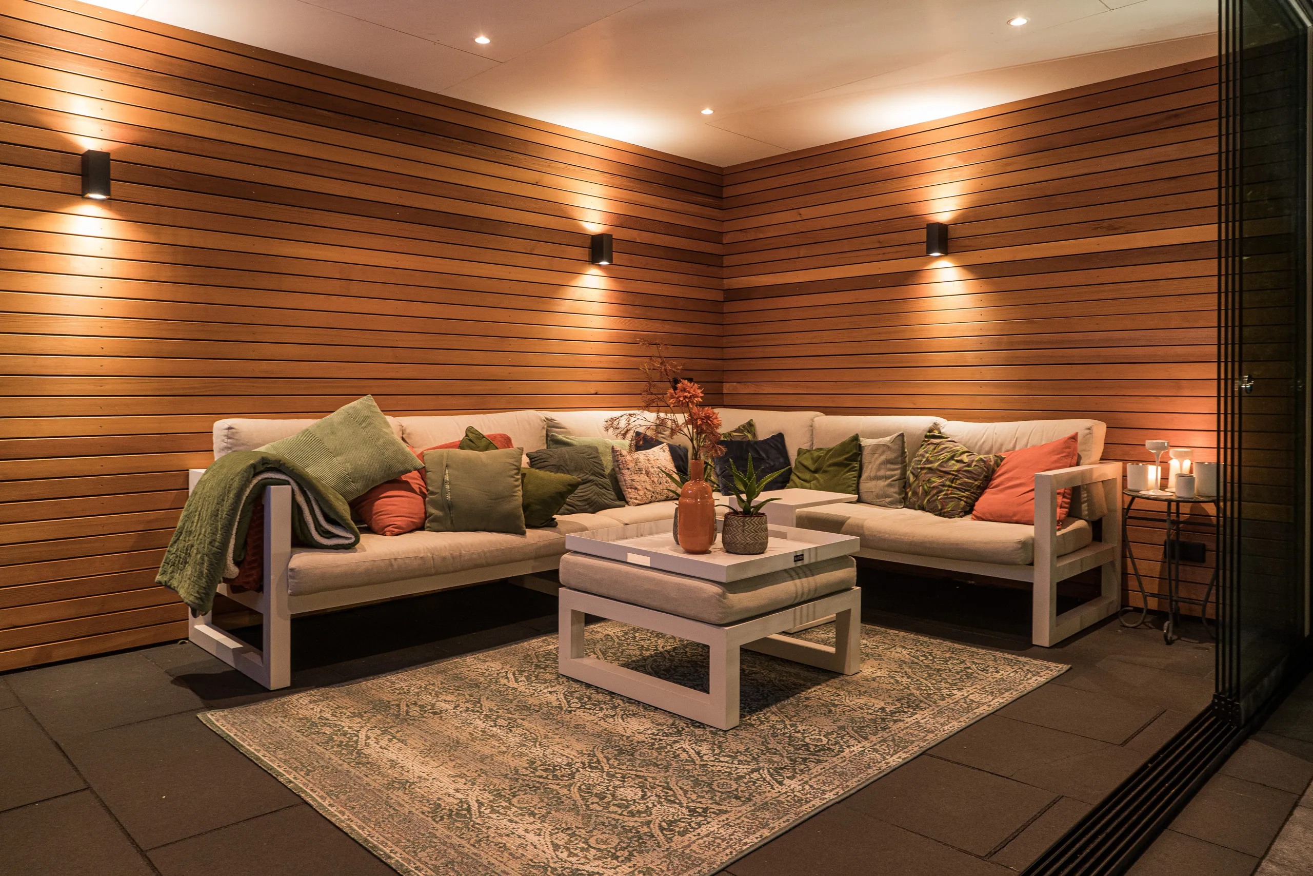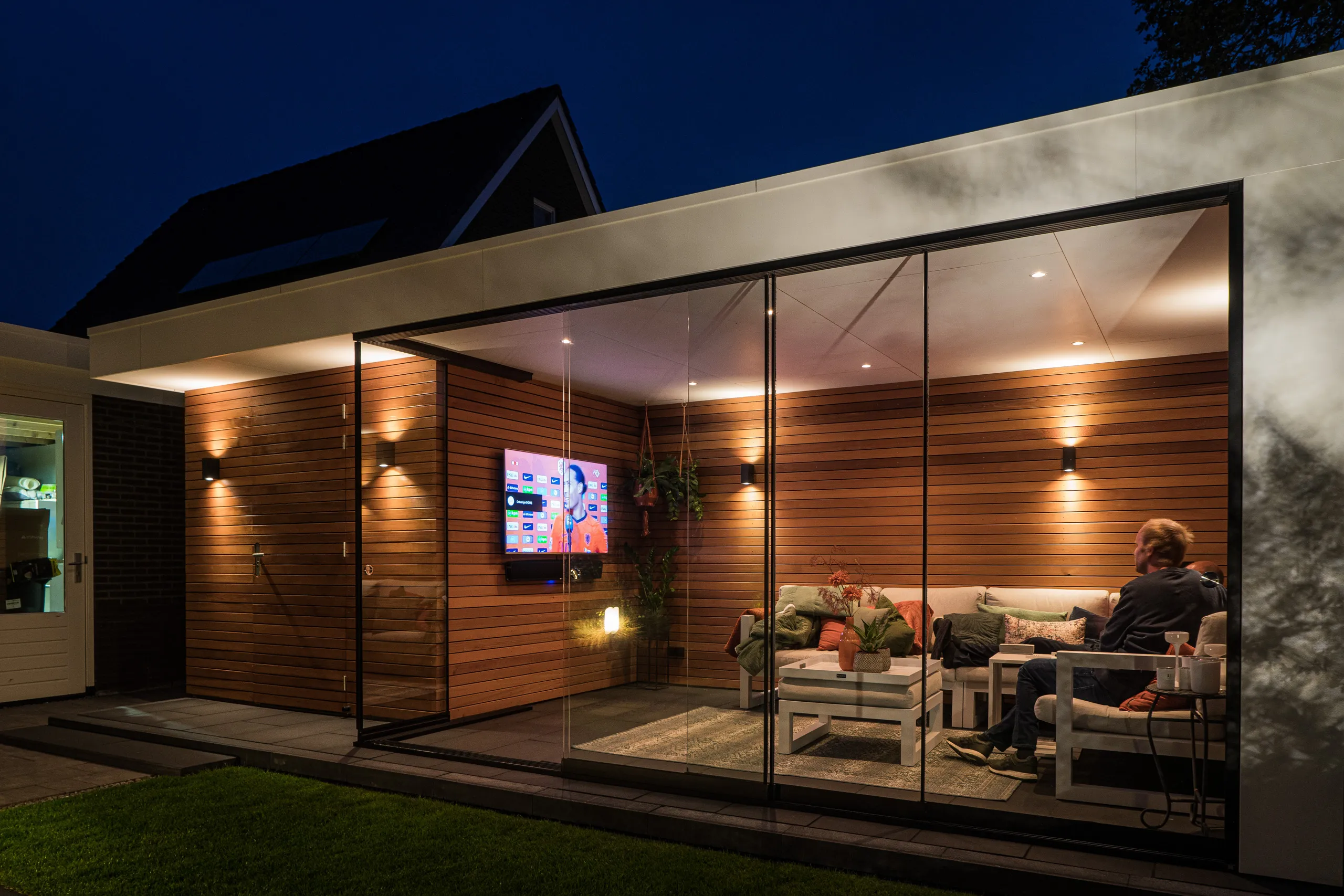 Prachtige tuinkamer van red cedar hout gecombineerd met een schuur. Door de schuifpui en televisie kan hier het hele jaar door buiten gezeten worden.