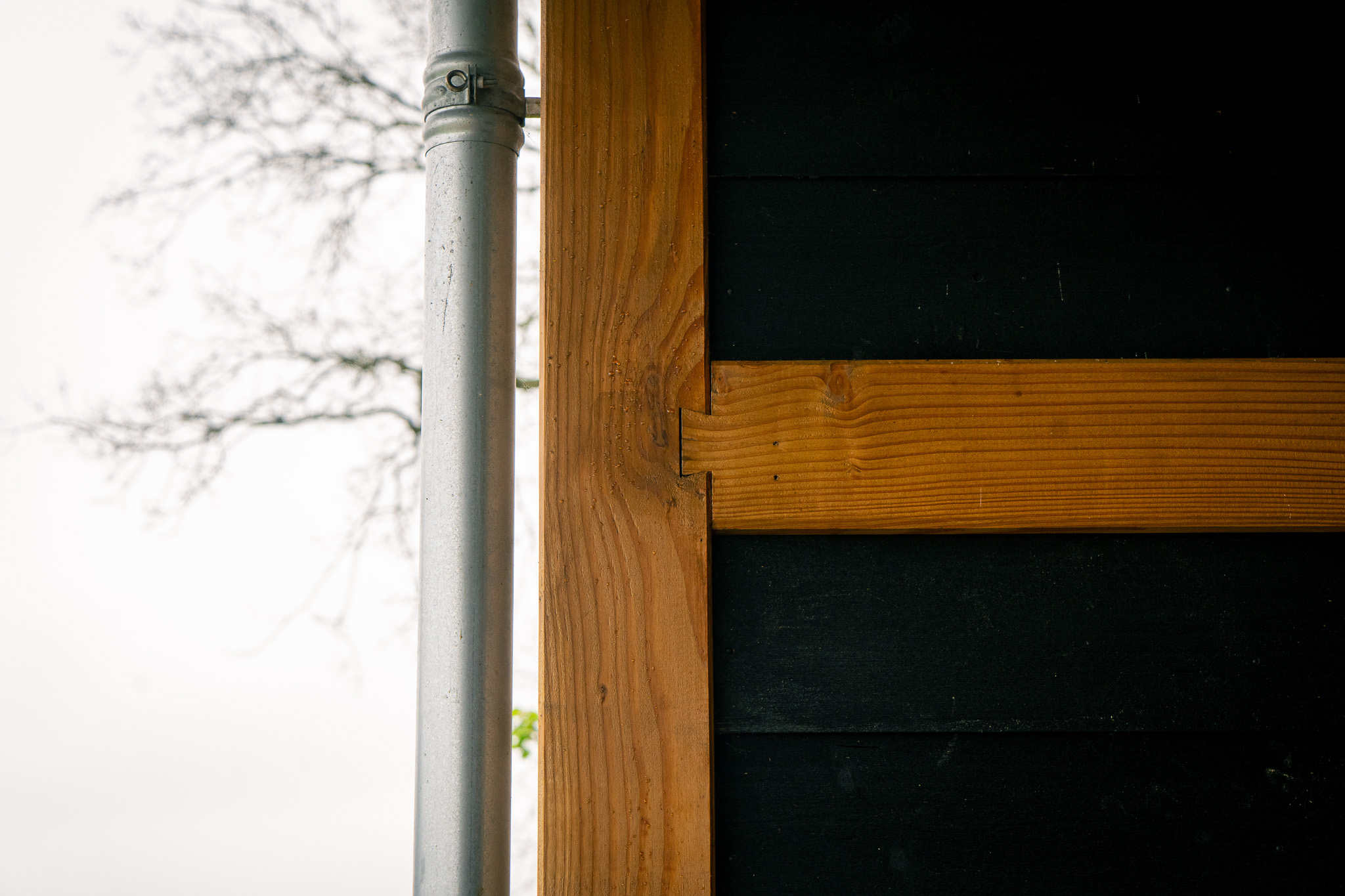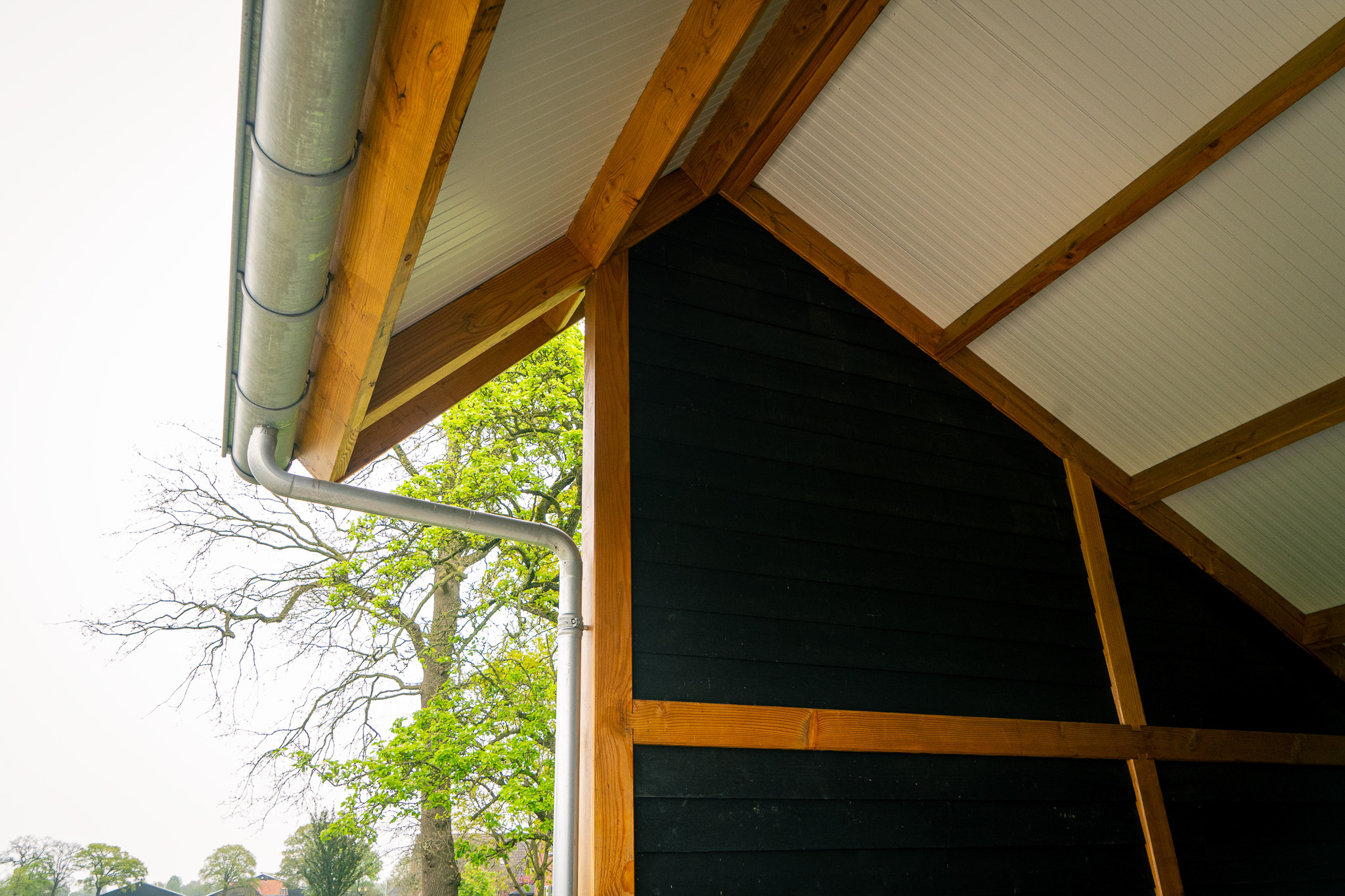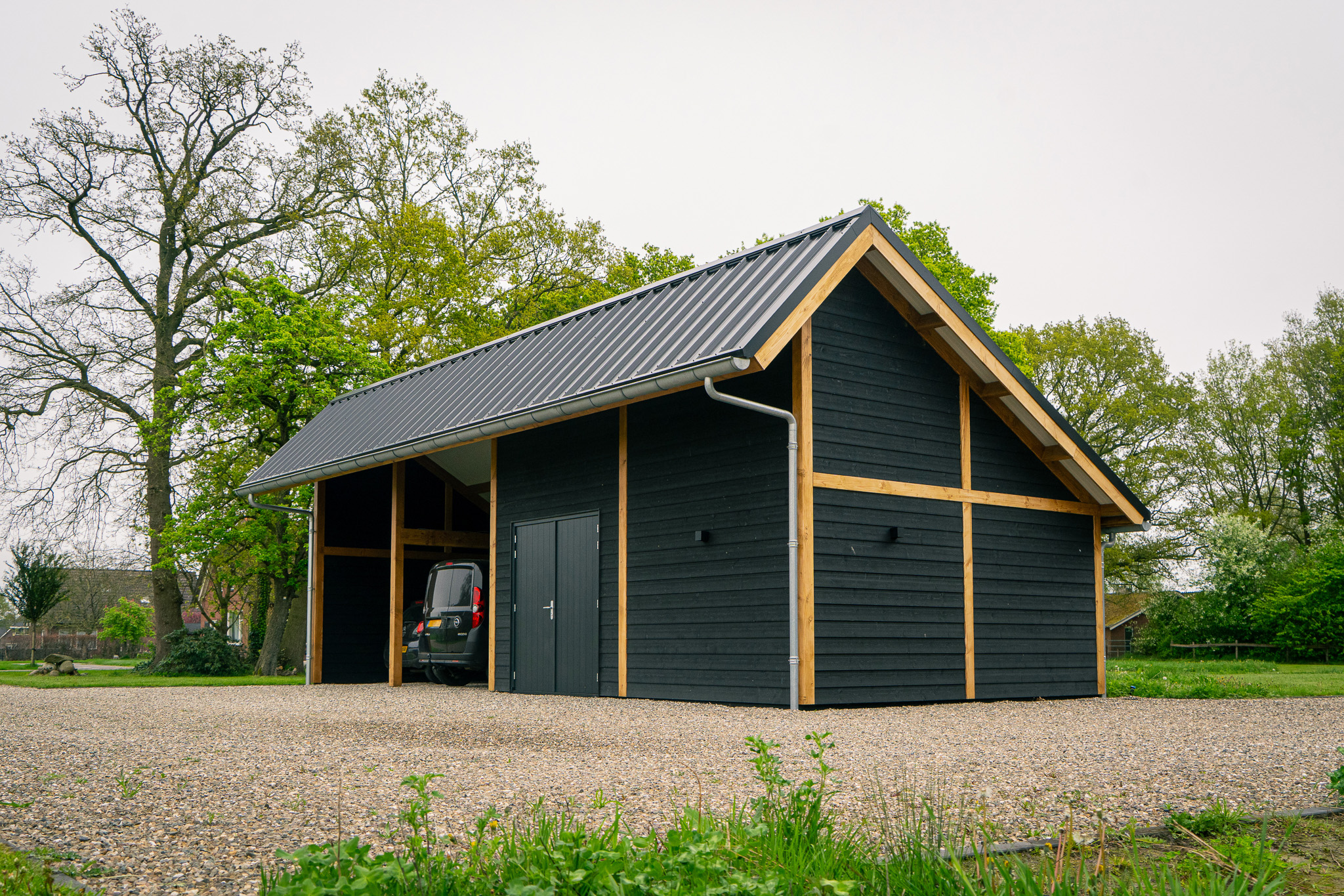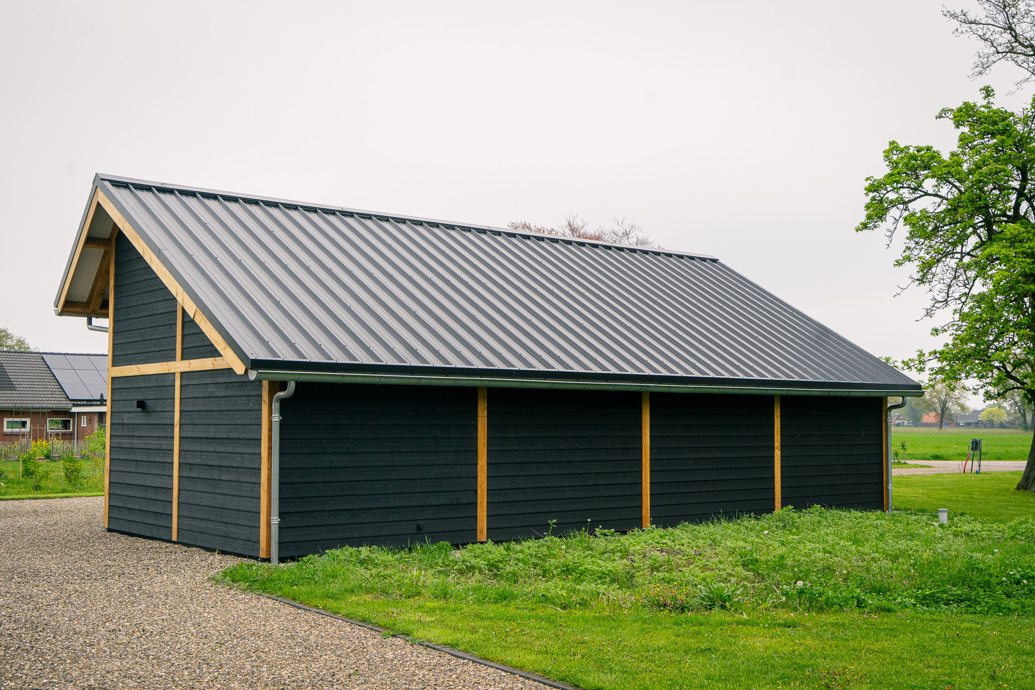 Deze prachtige kapschuur is gemaakt met blank Douglas, zwarte wanden en een geïsoleerd dak van sandwichpanelen.