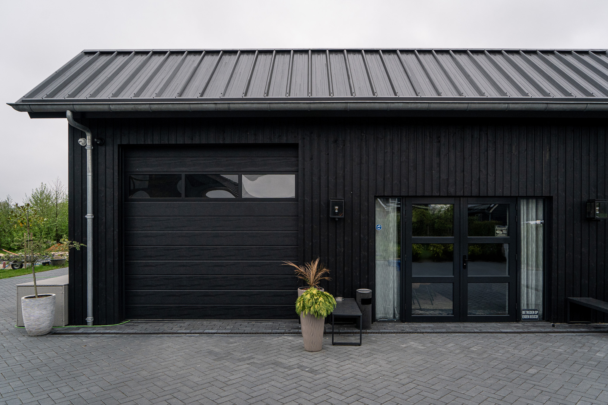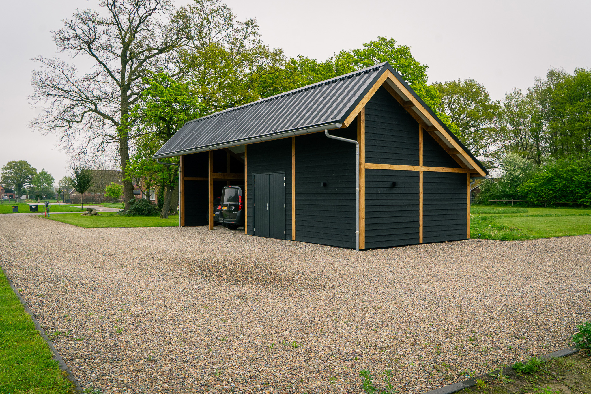 De dubbele carport met schuur is afgewerkt in dezelfde kleuren als de woning.